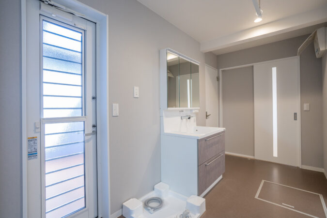 洗濯の後は中庭のウッドデッキに干したり、洗面室に備えた乾燥機で乾かしたりすることで、クローゼットへ収納するまでの作業を少ない移動で完結できます。
