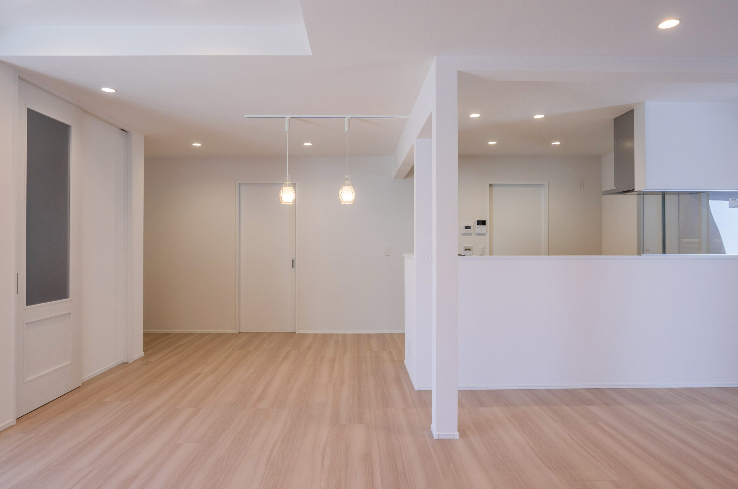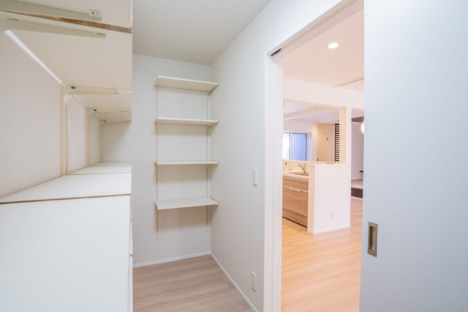 間仕切りをなくし、高さのある建具やダウンライトを採用したことで解放感もアップしました。キッチン背面の2つの扉は大容量の収納庫。家の物と食材ストックを分けで収納できますので、すっきりリビングが叶います。