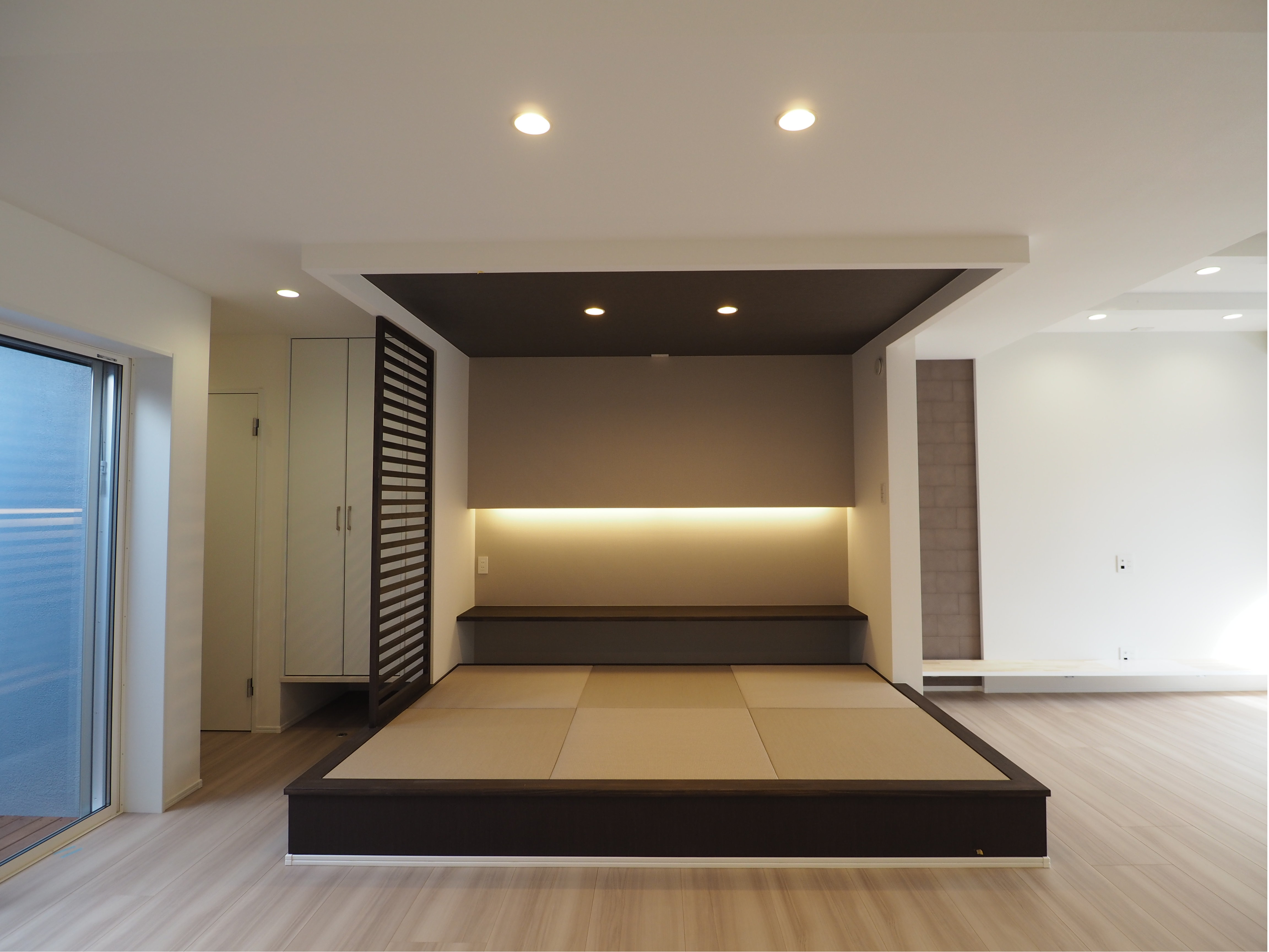 家族の気配を感じながらくつろげる小上がりは、ゴロゴロしたり、ちょっと腰掛けたりするのにちょうど良いスペース。ダークブラウン色を取り入れることで、落ち着いた雰囲気と空間のメリハリが生まれました。