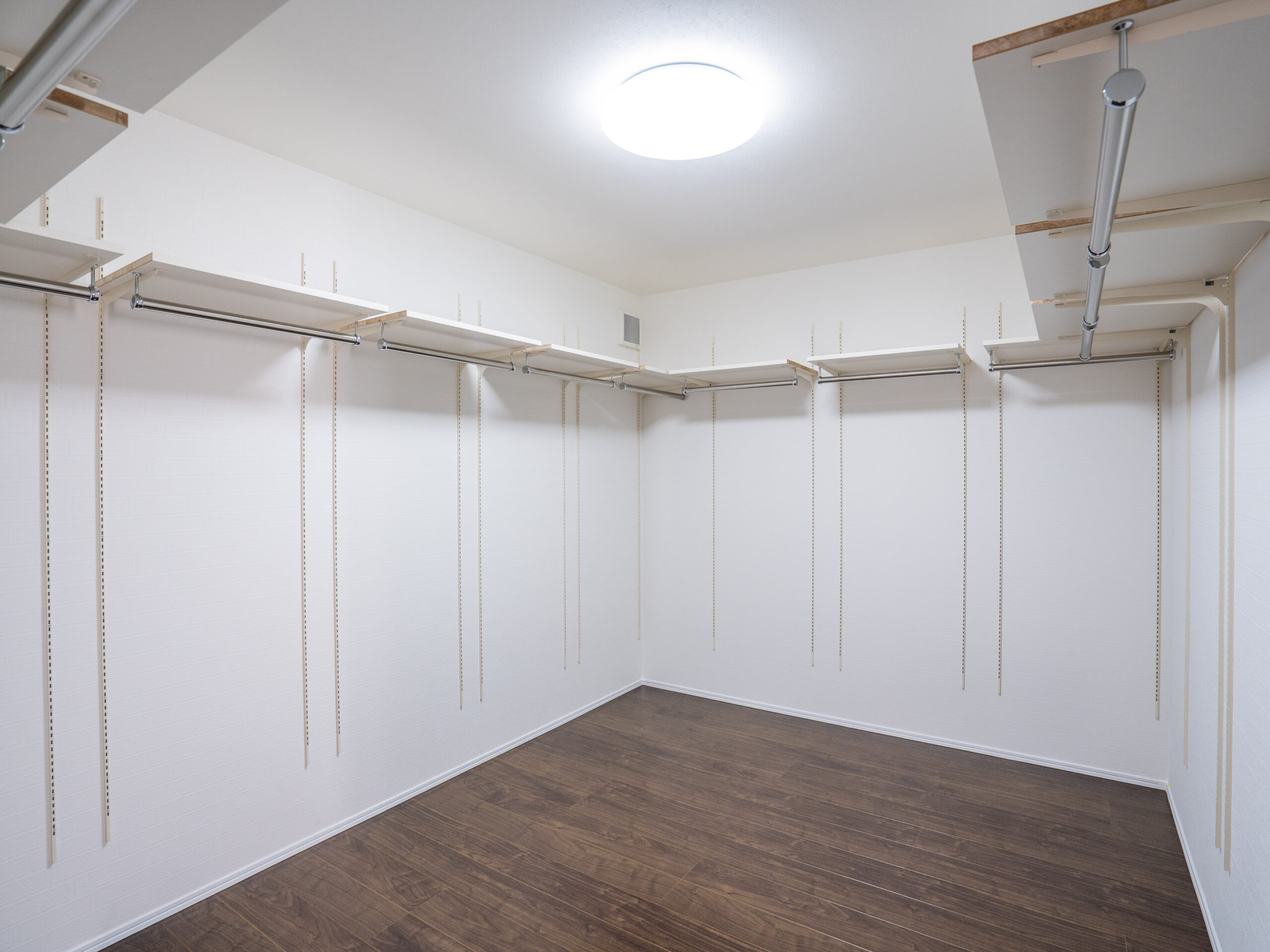 バッグなどを置ける棚付きのハンガーパイプを一面に取り付けました。
