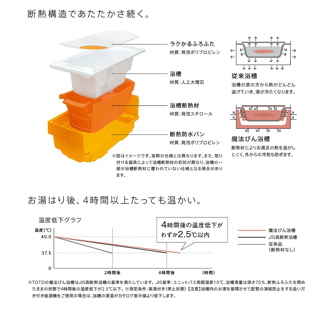 特徴として浴槽下部全体と蓋を断熱材で覆い、お湯を冷めにくくした浴槽のことです。これを施した浴槽は、お湯はり後、約4時間経っても約2.5度位しか温度が下がりません。家族が入る時間がバラバラになっても、少しの追い炊きですぐに温まります。時間も短縮されるだけでなく、エネルギーも少なくてすむので経済的。シリーズによってはオプションになっている時もありますが、一度入れた浴槽は長く使うことが多いので、設置することをお勧めしたい設備です。